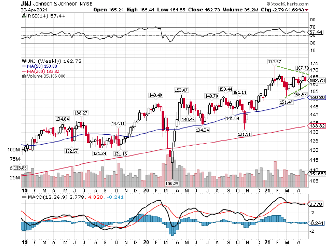 ジョンソン&ジョンソンの週足チャートを眺めると、三角保ち合いを形成しており、どちらか一方に大きく動く可能性が高まっています。