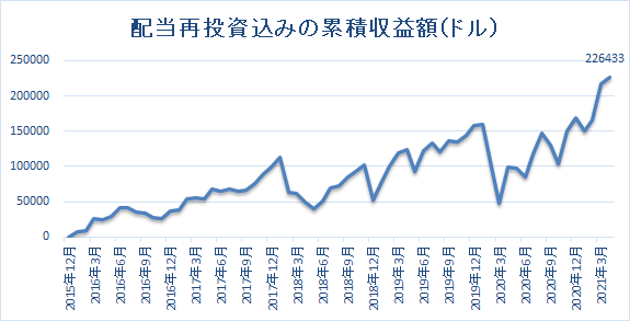 配当再投資込みの累積収益額は22万6433万ドル(約2474万ドル)と、過去最高を記録しました。