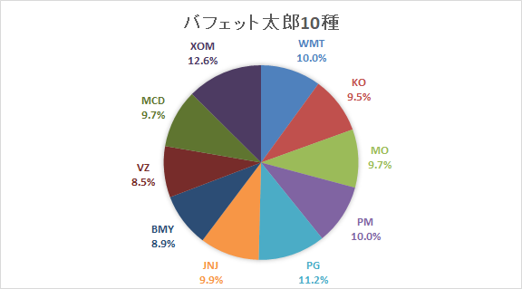 バフェット太郎10種における組み入れ比率は、エクソン・モービル(XOM)が12.6%と最大で、ベライゾン・コミュニケーションズ(VZ)は8.5%と最小です。そのため、5月はベライゾンを買い増す予定です。