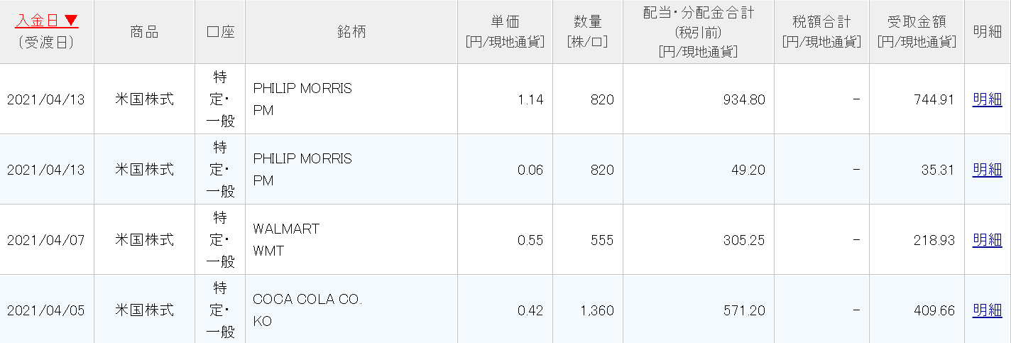4月はフィリップ・モリス・インターナショナル(PM)、ウォルマート(WMT)、コカ・コーラ(KO)の3社から、合計1860.45ドル(約20万3000円)、税引き後1408.81ドル(約15万4000円)の配当金を受け取りました。