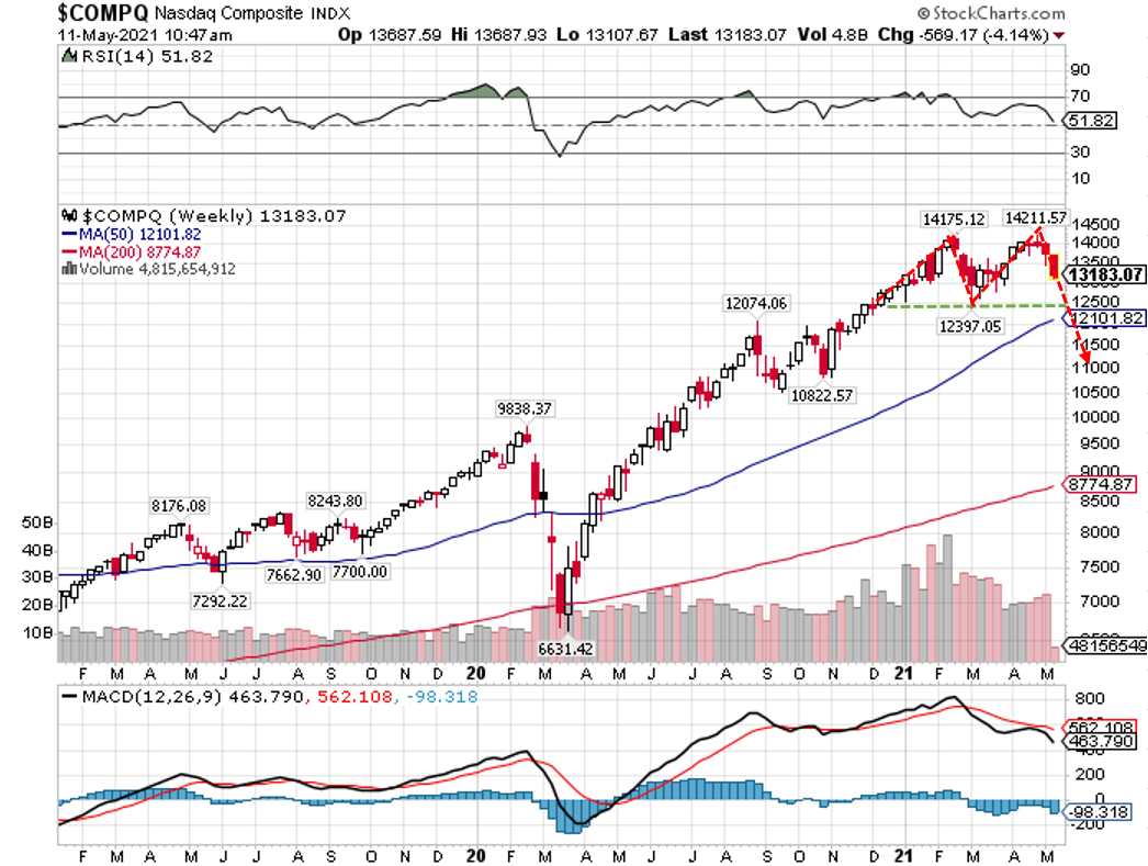 ナスダック総合指数の週足チャートを眺めると、相場の天井のシグナルとなるダブルトップを形成していることが確認できます。