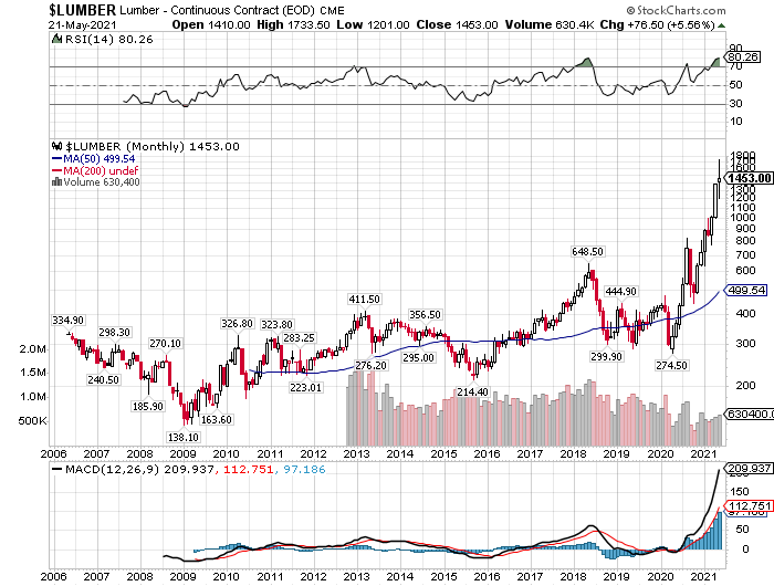 2006年以降、木材価格は概ね200ドル~400ドルのレンジで推移していましたが、コロナ危機以降、世界的な住宅需要の増大によって、今月は一時1733ドルまで大暴騰する場面がありました。