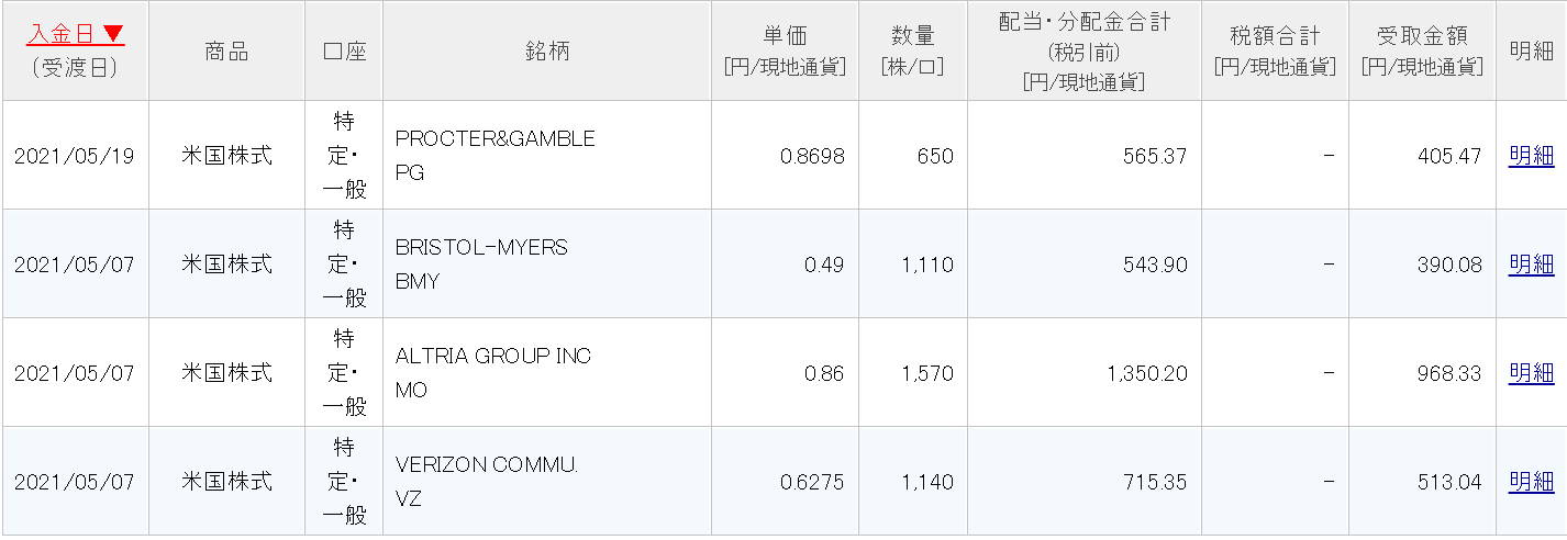 5月はプロクター&ギャンブル(PG)、ブリストル・マイヤーズ・スクイブ(BMY)、アルトリア・グループ(MO)、ベライゾン・コミュニケーションズ(VZ)の4社から、合計3174.82ドル(約34万7000円)、税引き後2276.92ドル(24万9000円)の配当金を受け取りました。