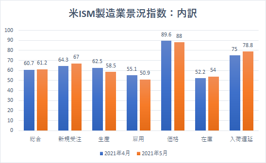 ISM(米供給管理協会)が発表した5月のISM製造業景況指数は、予想60.9に対して、結果61.2と予想を上回りました。また、前月の60.7から0.5ポイント上昇しました。