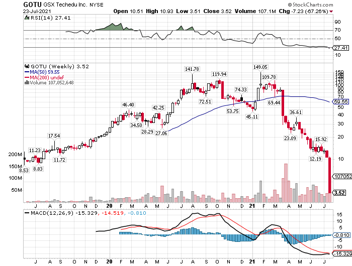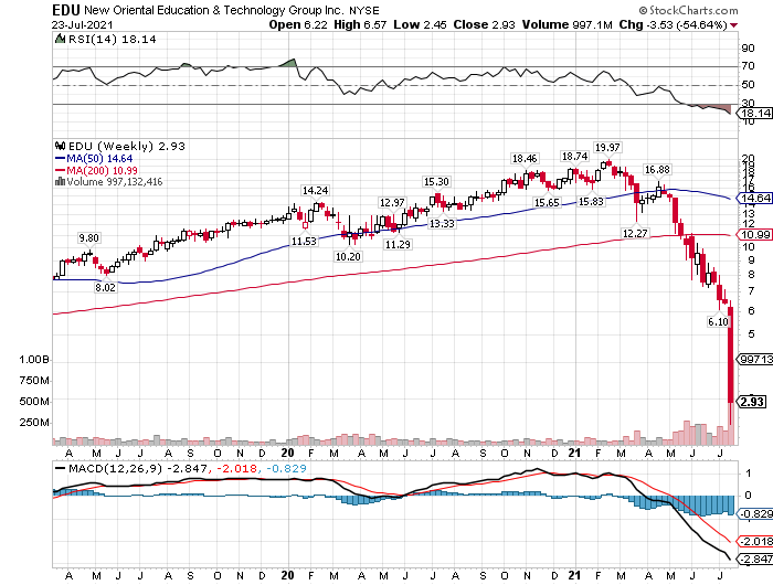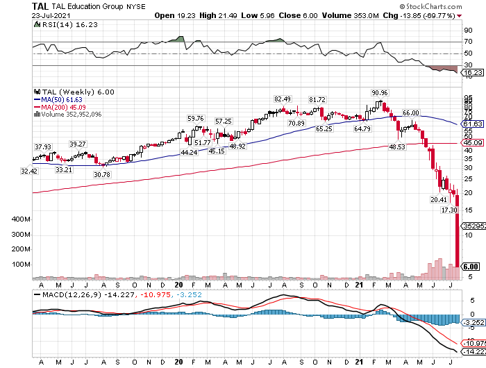 たとえば、TALエデュケーション(TAL)は2月の高値から93%安、ガオトゥー・テックエデュ(GOTU)は1月の高値から98%安、ニューオリエンタル・エデュケーション(EDU)は2月の高値から85%安と、株券がほぼゴミクズになろうとしています。