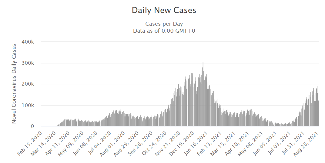 米国の一日当たりの新規感染者数は8月に一時19万人に上る場面がありましたが、現在は15万6000人に減速していることから、ピークアウトした可能性があります。