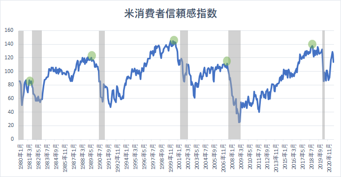 さて、1980年以降の消費者信頼感指数を眺めると、指数が下落トレンドに入った後にリセッション(景気後退)入りしていることがわかります。