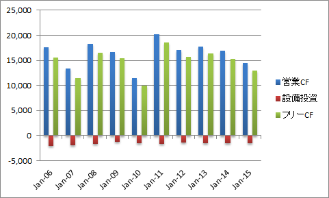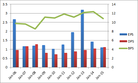 EPS(一株当たりの利益)のブレは大きいですが、通期EPSは新ガイダンスで2.38~2.48ドルと予想されています。DPS(一株当たりの配当)はリーマンショック以降、二年連続で減配していますが、11年以降増配が続いています。また、配当性向が心配されていましたが、通期EPSが2.38~2.48ドルと予想されていることから、配当性向は50%未満になりそうです。BPS(一株当たりの純資産)はゆるやかに成長しています。