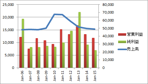 業績は長期的に見るとほぼ横ばいで成長していません。15年12月期は、好採算のワクチンや乳がん治療薬「イブランス」など新薬が好調でした。一方で既存薬が減少しました。後発薬は「ホスピーラ」が一部寄与しましたが、ドル高の影響を受けて為替差損が発生したことに加えて、訴訟和解費などで純利益は続落しました。