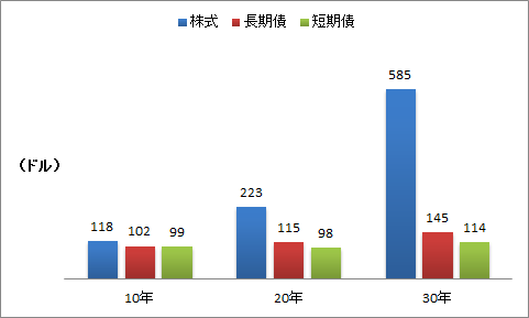 保有期間が10年と短い場合でも株式は長期債、短期債の利回りを上回り、30年においては株式の利回りは短期債の5倍、長期債の4倍にもなりました。