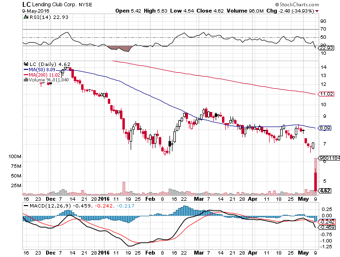 ソーシャル・レンディング・サービスの最大手、米レンディング・クラブ(LC)のルノー・ラプランシュCEOが辞任したことを受けて、株価は前日比-34.93%と暴落しました。LCの取締役会は不適切な融資慣行の情報開示をめぐる調査を実施していました。そもそもこのLCはP2P(ピアtoピア)技術を利用した融資で、個人と個人のお金の貸し借りを仲介しています。主な収益源はその仲介手数料でした。ネット利用で経費を削減し、従来の金融機関よりも高い預金金利、低い借り入れ金利を実現しました。