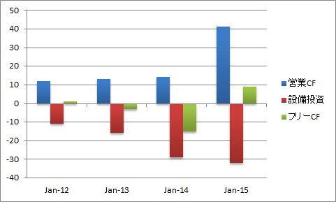 設備投資が大幅に増加していますが、本業の儲けはそれ以上に増加しているのでフリーCFが黒字に転じています。