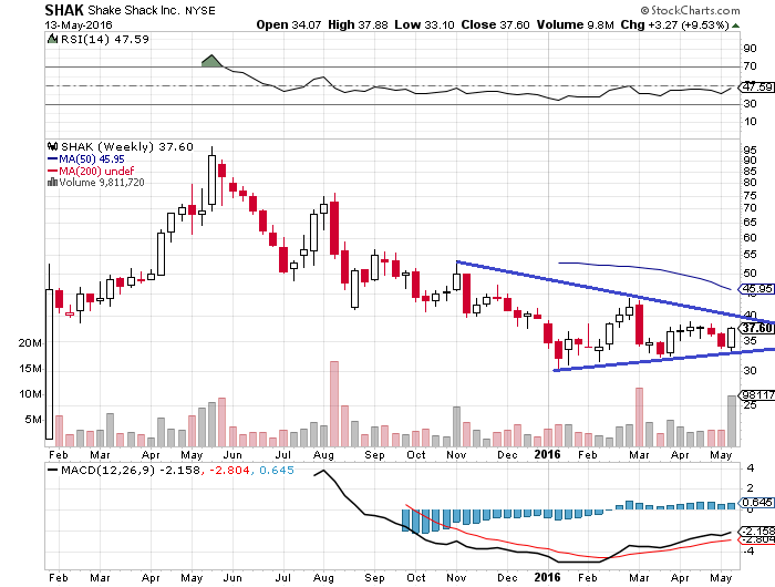 SHAKの週足チャートを眺めると、下値が徐々に切り上がっている一方で、上値は徐々に切り下がっており、三角保ち合いを形成しています。この場合、どちらか一方に大きく放たれる傾向にあるので、38~40ドルにレジスタンス(上値抵抗線)をブレイクアウトすれば株価に勢いがあると判断していいと思います。ただし反対に下にブレイクアウトした場合は損切をしなければなりません。