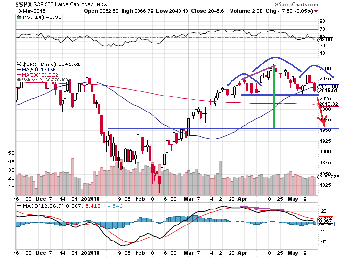 二、ヘッドアンドショルダーは青のラインで示しました。三つの山のうち、中央の山が頭、両サイドの山が肩を表すことからヘッドアンドショルダーと言われます。このヘッドアンドショルダーが相場の天井圏に出現すると「売り」シグナルになります。反対に、底値圏で出現すると「買い」シグナルです。今回は天井圏に出現しているので当然「売り」シグナルなのですが、問題は目標株価はいくらなのか?ということです。目標株価はヘッドアンドショルダーの首の位置にあるネックラインからヘッドの幅だけ下落します。この場合、ヘッドは2110ドル、ネックは2040ドルなので、1970ドルくらいまで下落すると予測します。