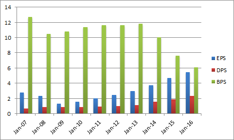 住宅市場の回復に伴いEPS(一株当たりの利益)は上昇傾向にありますが、2014年からBPS(一株当たりの純資産)が急減しています。BPSが急減している主な要因は、長期借入金を増やしているためで、HDは資本効率を急速に高めています。結果的にROE(自己資本利益率)は2009年12.74%だったのに対して、2016年は89.64%にまで高まりました。