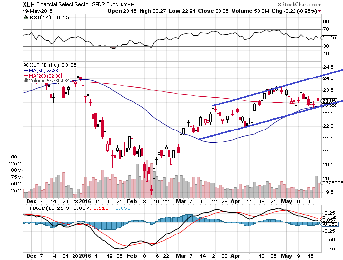 チャートは金融セレクト・セクターSPDRファンド(XLF)の日足チャートです。XLFは金融セクターから選抜した米国株で構成されてる指数に連動に92銘柄が組み入れられています。チャートを眺めると、上昇トレンドチャネルを形成していることがわかります。加えて、50日移動平均線が200日移動平均線を上回ろうとしており、ゴールデンクロス(買いシグナル)を示しています。ヘッドアンドショルダー形成後、売りシグナルを出しているS&P500指数とは対照的です。