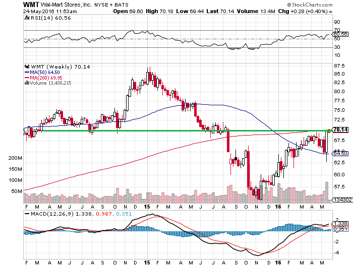 WMTの週足チャートです。昨年の11月に底打ちして以降、大きく上昇してきました。今週はレジスタンス(上値抵抗線)の70ドルを突破できるかが注目されます。