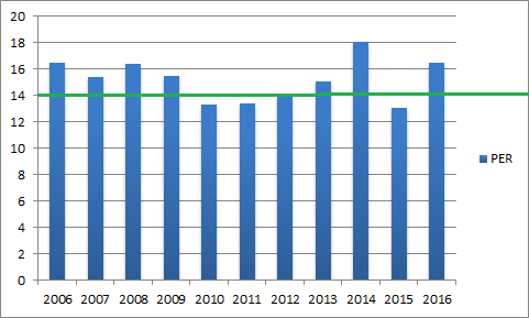 WMTの予想PERは16.5倍と過去5年平均の14倍を上回っています。