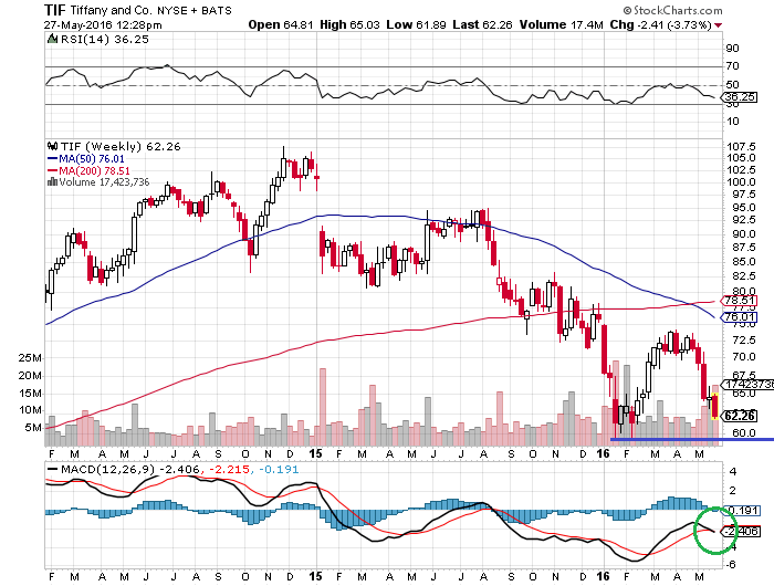 TIFの週足チャートです。59ドルがサポートラインになります。また、MACDにはデッドクロスの「売り」シグナルが出ています。
