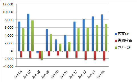 本業の儲けを示す営業CFは金融危機で一時マイナスに転じたものの、2012年以降は堅調に推移しています。ただし、業績は景気に大きく左右されるので、株価は乱高下しやすいです。