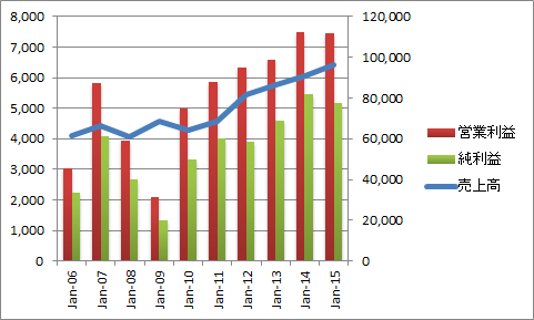 金融危機で業績が大きく悪化したものの、2010年には持ち直して堅調に推移しています。長期トレンドは右肩上がりです。