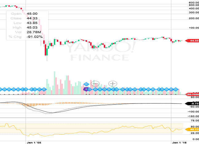 株価はピークの550ドルから45ドルと90%以上減少したままです。これは金融株のなかでも特に大きい落ち込みが激しくて、他にはバンク・オブ・アメリカ(BAC)の75%減といった例もあります。