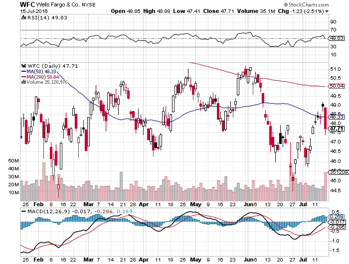 決算内容は予想を上回ることが期待されていだだけに、株価は前日比-2.51%安と、英国のEU離脱危機以来の下げ幅となりました。ただし、WFCは米国の住宅ローンや中小企業向け融資、また自動車ローンが主力であるため欧州の景気に業績をあまり左右されません。