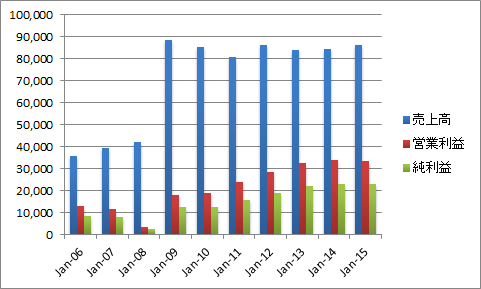 09年以降売上高が倍増しているのは、08年にワコビア銀行を合併したためです。以降、売上高こそ横ばいが続くものの利益率は改善されています。