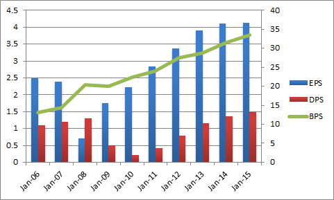BPS(一株当たりの純資産)は順調に拡大しています。一方でDPS(一株当たりの配当は)は金融危機時に信用状況がさらに悪化した場合に備えるための余剰資本を短期的に増やすため、大きく減配しました。また、Fedからの要請により公的資本の注入を半強制的に受けざるを得ませんでした。別の言い方をすれば、WFCは金融危機で最も安全だった銀行のひとつだということです。