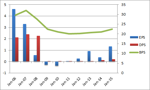 一方でEPS(一株当たりの純利益)はピークの三分の一にも満たないです。これは金融危機以降、公的資金の注入により発行済み株式数の母数が増加し、一株当たりの価値が希薄化したためです。